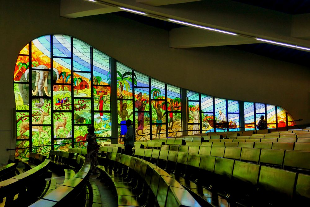 L’intérieur de la Cathédrale Saint-Paul baigne dans une lumière colorée d’une beauté saisissante, filtrée par des vitraux exceptionnels qui racontent l’histoire du christianisme en terre ivoirienne. Ces œuvres d’art lumineuses transforment chaque rayon de soleil tropical en message spirituel, créant cette atmosphère unique de recueillement moderne qui caractérise cette cathédrale d’exception.